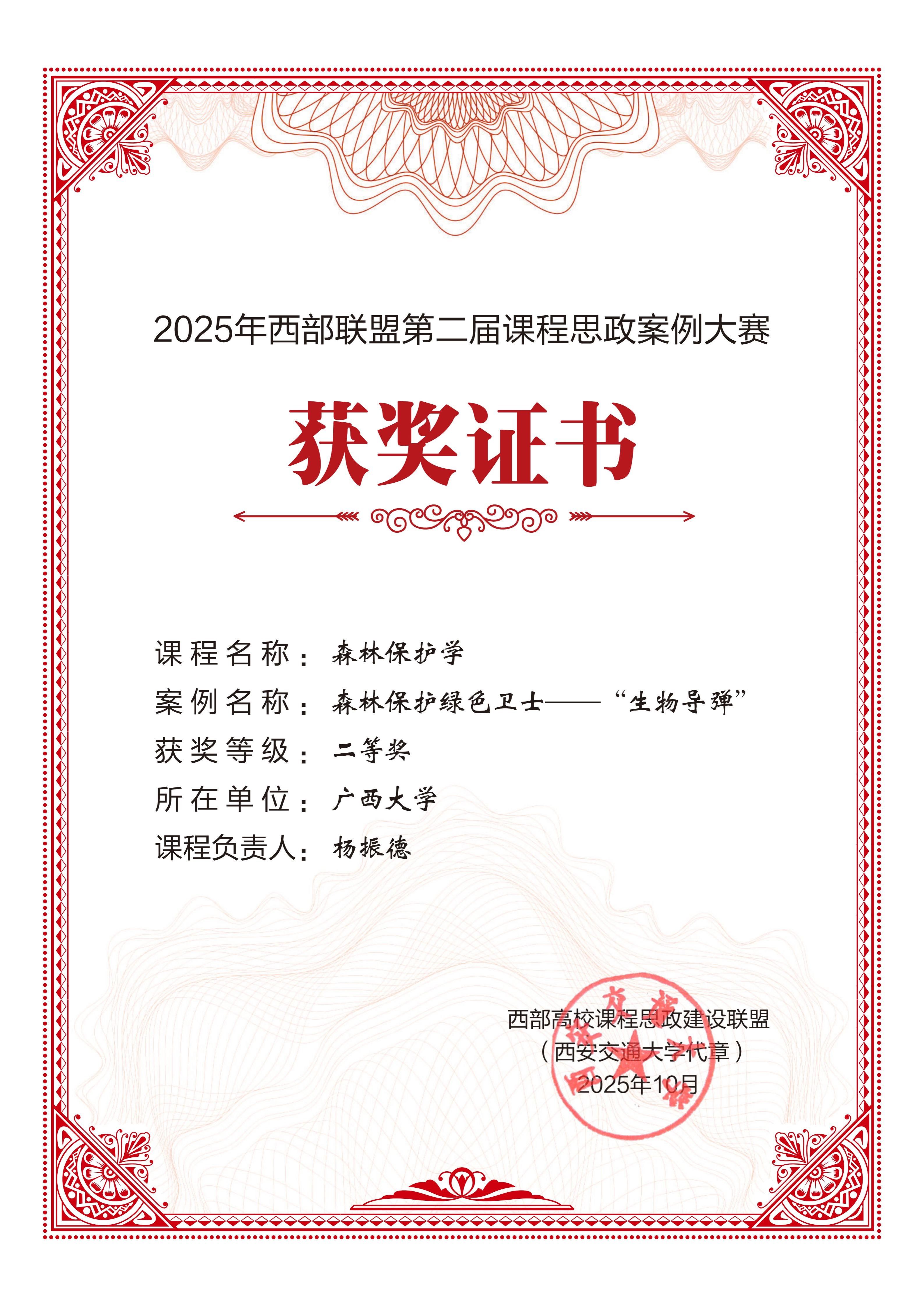 近日,西部高校课程思政建设联盟第二届课程思政案例大赛结果揭晓,太阳成集团tyc7111cc杨振德教授申报的《森林保护学》课程思政案例——《森林保护绿色卫士——“生物导弹”》喜获二等奖。作为西部高校课程思政建设的重要交流平台,本届大赛得到各高校积极响应,竞争激烈。此次公司共组织申报6项案例,1项成功获奖。