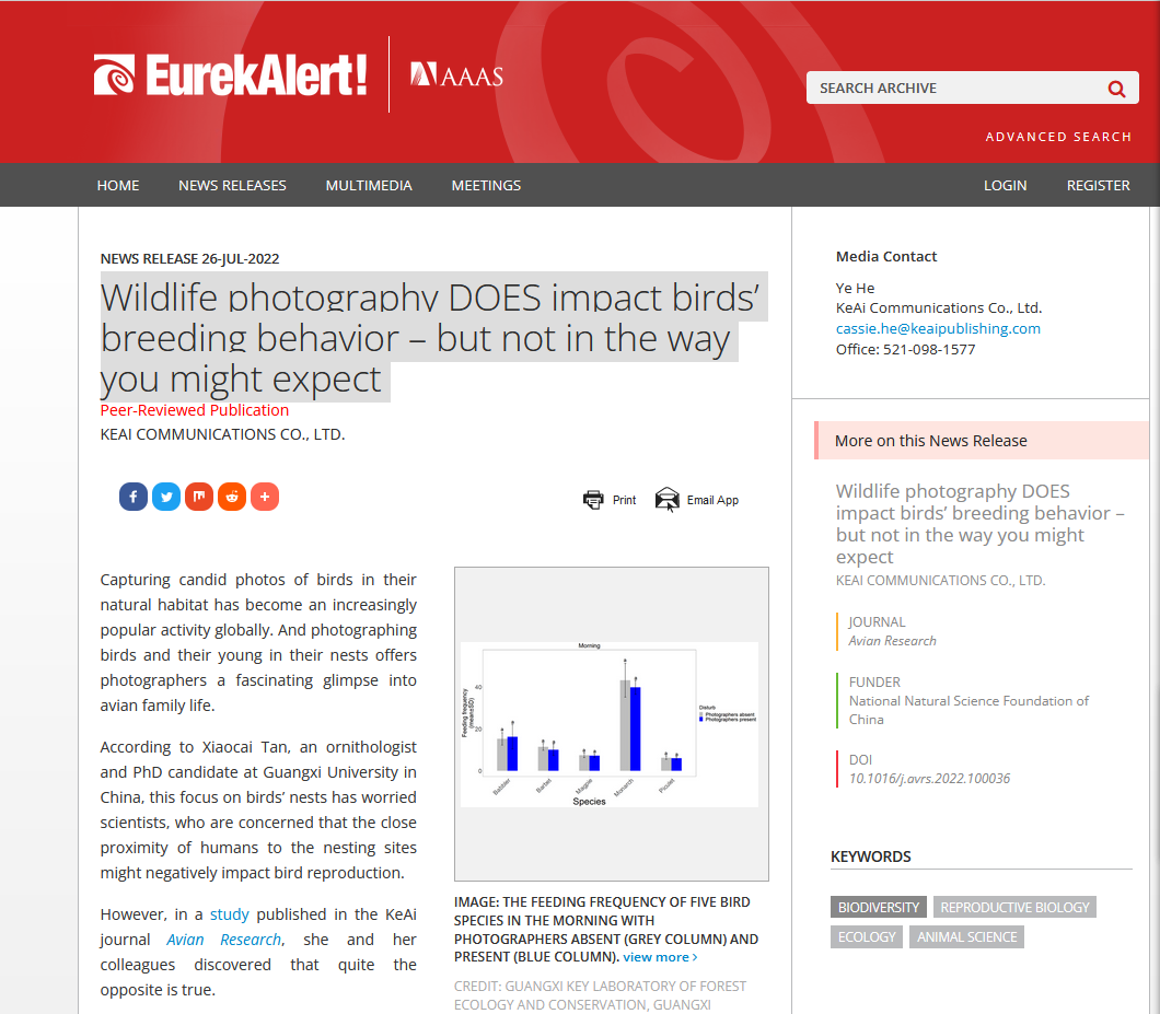 近期,《Avian Research》发表公司喀斯特森林鸟类科研成果“Does bird photography affect nest predation and feeding frequency?”公司生态学博士生谭筱彩为第一作者,蒋爱伍副教授为该研究论文的通讯作者。文章上线后,美国科学促进会(AAAS)主办的全球科学新闻发布平台“EurekAlert!”以“Wildlife photography DOES impact birds breeding behavior – but not in the way you might expect”为题对该成果进行了报道,认为该研究加深对野生动物摄影及潜在效应的认识,对喀斯特森林生物多样性保护具有重要的意义。