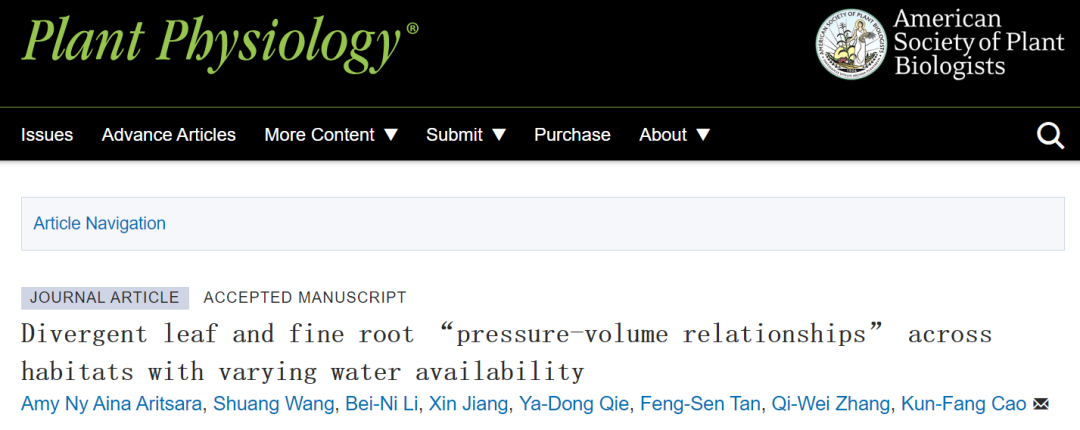 近日,太阳成集团tyc7111cc“亚热带农业资源保护与利用国家重点实验室”植物生理生态与进化课题组曹坤芳教授团队在Plant Physiology发表了题为Divergent leaf and fine root“pressure-volume relationships”across habitats with varying water availability的研究论文,揭示了不同生境木本植物水力“熔断”机制。
