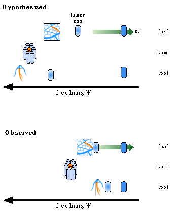 本研究用光学法同时测定了两种红树植物(白骨壤Avicennia marina和木榄Bruguiera gymnorrhiza)幼苗的根、茎、叶的抗栓塞脆弱性曲线(抗栓塞能力可以指征植物的抗逆能力,如抗旱性),根和叶的膨压丧失点(压力-体积曲线),以及木质部的解剖特征。本研究假设:1)与气孔调节不敏感的白骨壤相比较,气孔调节敏感的木榄有栓塞抗性更脆弱的根、茎、叶结构;2)依据脆弱性分区假说,叶片会比茎和根栓塞抗性更脆弱;3)虽然栓塞抗性会有种间或者个体差异,个体内各器官间将有栓塞抗性的协调;4)气孔关闭将先于膨压丧失和早期栓塞扩散,各干旱反应指标之间的水力安全边界较大(图1)。