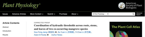 1.Jiang GF*(蒋国凤),Li SY, Li YC, Roddy AB (2022) Coordination of hydraulic thresholds across roots, stems, and leaves of two co-occurring mangrove species. Plant Physiology:1-16.