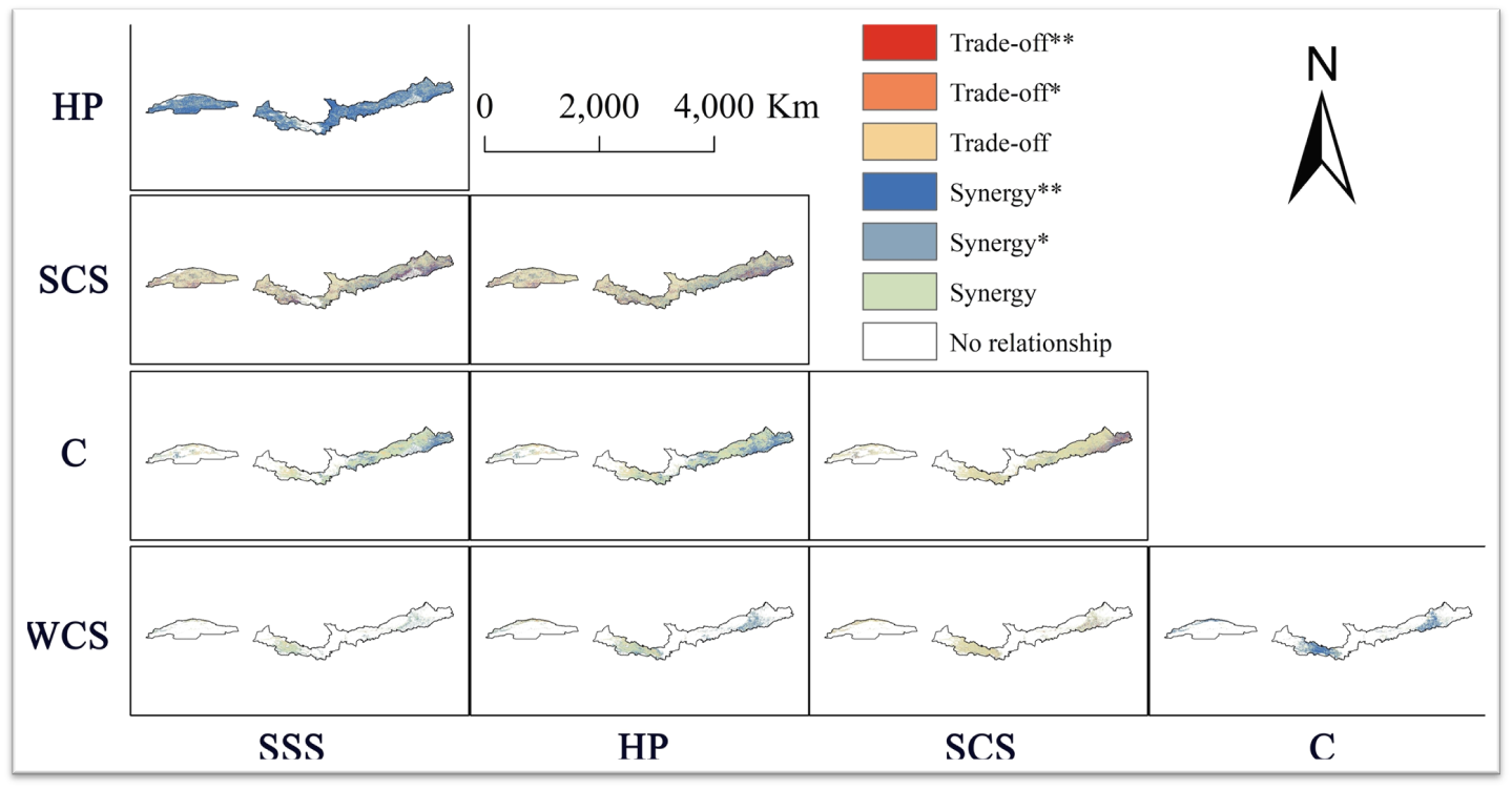 图1生态系统服务的协同与权衡空间分布格局 防风固沙服务(SSS)和栖息地提供(HP)之间的协同占据了研究区域的86.67%,其中显著协同占据了49.08%。土壤保持服务(SCS)和栖息地提供(HP)之间的权衡区域是10种关系中最大的(34.52%),主要分布在河西走廊和塔里木盆地,以弱权衡关系为主。包括水源涵养服(WCS)在内的,不相关关系都占据了研究区域的75%以上。碳固存服务(C)和土壤保持服务(SCS)间的不相关关系(43.97%)分布在塔里木盆地的南部,河西走廊的西部,河西走廊和内蒙古高原之间的平原,土地利用类型以荒漠为主。