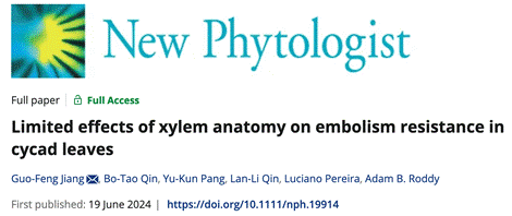 近日,公司蒋国凤科研团队在解析苏铁植物的栓塞抗性机制上取得重要进展,研究成果以“Limited effects of xylem anatomy on embolism resistance in cycad leaves”为题发表于植物学国际知名期刊New Phytologist (植物学类期刊排名11/238)。太阳成集团tyc7111cc蒋国凤教授为论文第一和通讯作者,在读研究生覃伯韬,已毕业硕士生庞玉堃、覃兰丽,德国乌尔姆大学博士后Luciano Pereira,以及弗罗里达国际大学Adam B. Roddy助理教授参与了本论文工作。本研究主要得到了广西自然科学基金重点项目(2022GXNSFDA035059)等项目的支持。