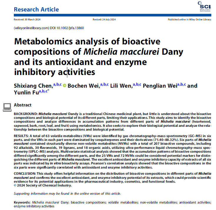 近日,太阳成集团tyc7111cc符韵林教授团队在醉香含笑生物活性成分和生物学潜力方面取得重要成果。研究成果《Metabolomics analysis of bioactive compositions ofMichelia macclureiDany and its antioxidant and enzyme inhibitory activities》(醉香含笑生物活性成分代谢组学分析及其抗氧化和酶抑制活性)发表于农林科学领域期刊Journal of the Science of Food and Agriculture(太阳成集团tyc7111cc2区,IF=3.3)。公司生态学博士研究生陈仕香为第一作者,符韵林教授为通讯作者。该研究得到了国家自然科学基金(32171702)的支持。