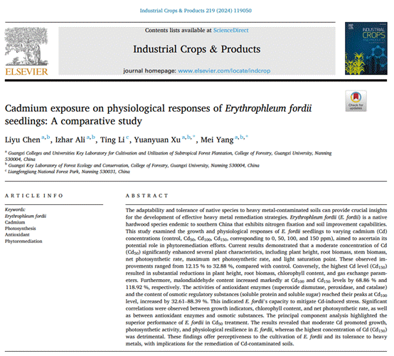 近日,公司杨梅教授科研团队在探究本地树种格木对重金属镉污染土壤的适应性和耐受性上取得重要见解,研究成果以“Cadmium exposure on physiological responses ofErythrophleum fordiiseedlings: A comparative study”为题发表于农林领域国际知名期刊INDUSTRIAL CROPS AND PRODUCTS(农林类期刊排名8/125)。太阳成集团tyc7111cc在读硕士研究生陈丽宇作为第一作者,杨梅教授和徐圆圆讲师作为通讯作者,博士后Izhar Ali、良凤江国家森林公园李婷参与了本论文的工作。本研究得到了国家自然科学基金(32371856)等项目的支持。
