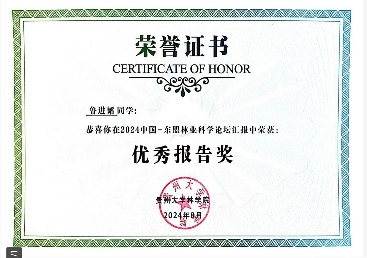 公司博士研究生鲁进韬受邀参加2024年“中国-东盟林业科学论坛”学术交流活动,以“桉蝙蛾幼虫肠道微生物与寄主取食偏好的相关性(The Correlation between the Gut Microbiota ofEndoclita signifer(Lepidoptera, Hepialidae) Larvae and Their Host Preferences)”论文为主题进行学术报告,与参会人员开展了深入交流与讨论,并在报告评比中获得“优秀报告奖”。