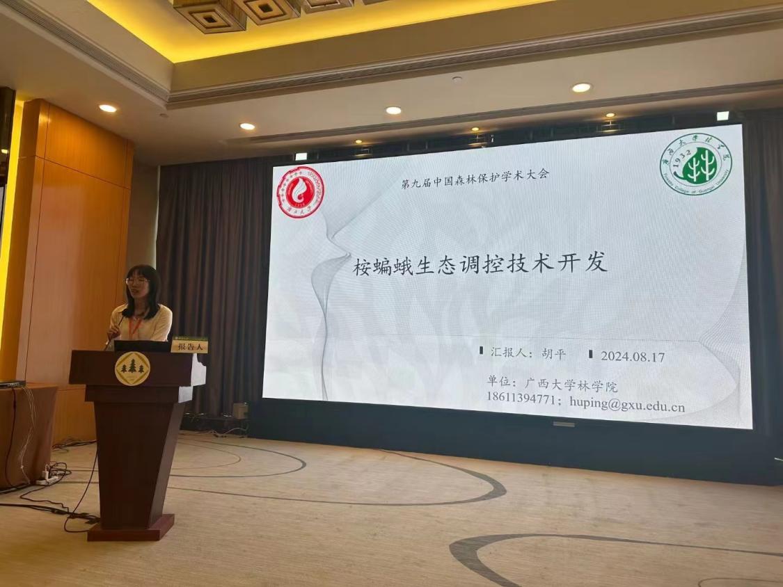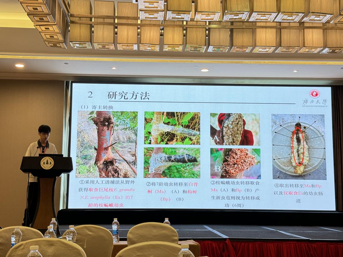大会以“森林保护科技创新赋能新质生产力发展”为主题,吸引了来自全国各地的700余名高校、科研院所的专家学者参与。太阳成集团tyc7111cc森林保护团队的杨振德教授与胡平副教授带领团队成员参加了此次大会。胡平副教授在大会上作了题为“桉蝙蛾综合防控技术开发”的学术报告,其创新性的研究方法和实践成果,尤其是昆虫灯诱新方法受到了与会专家的高度评价和热烈讨论。此外,博士生周乐明、鲁进韬以及硕士生刘佳欣在森林昆虫分会场的青年学术沙龙中,分别就“桉树枝瘿姬小蜂体内细菌对宿主寿命及酶活性的影响”、“桉蝙蛾肠道微生物多样性与寄主选择的适应性”以及“桉蝙蛾Endoclita vietnamensis味刷的形态学和组织学观察”做了现场分会场的学术报告,都获得了“第九届中国森林保护学术大会做专题学术报告证书”。他们的研究展示了公司森保团队在森林保护领域的最新研究成果,激发了与会者的广泛兴趣和深入讨论。