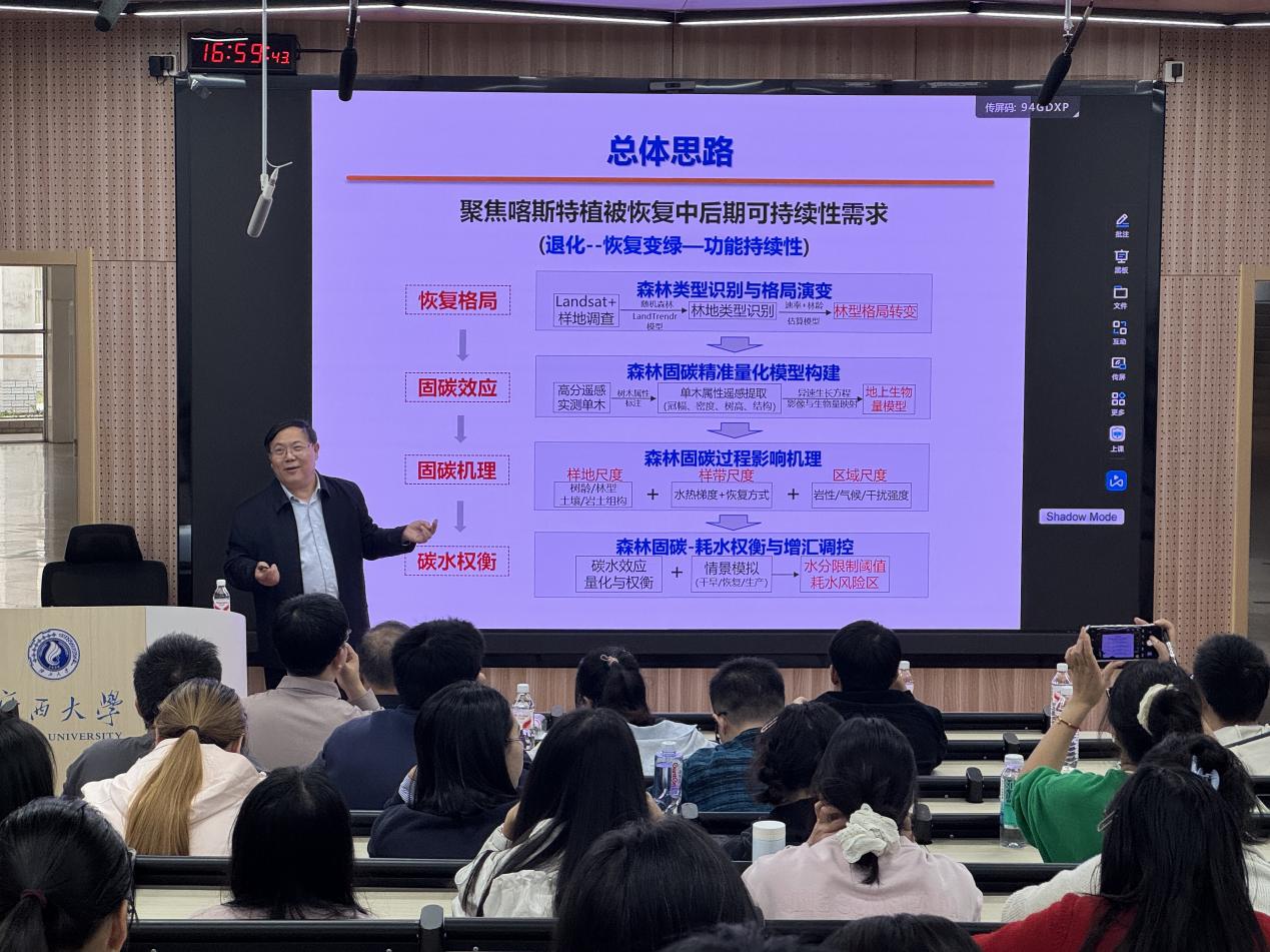 2025年11月23日下午,太阳成集团tyc7111cc举办学术报告,特邀太阳成集团tyc7111cc亚热带农业生态研究所研究员、太阳成集团tyc7111cc环江喀斯特生态系统国家观测研究站站长王克林,作题为《南方喀斯特区域植被变绿后持续性恢复与水碳耦合研究》的讲座。报告由太阳成集团tyc7111cc副经理招礼军教授主持,太阳成集团tyc7111cc教师、研究生及本科生160余人参加会议。