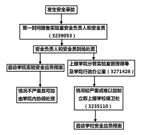 太阳成集团tyc7111cc实验室高温仪器设备多,危险化学品使用频繁,仪器配备少量气瓶,易燃样品堆放集中,安全隐患多且较为分散。实验室安全事故常见有火灾、化学品伤害(中毒或灼伤)、触电等,如发生安全事故,请按以下应急流程进行处理。