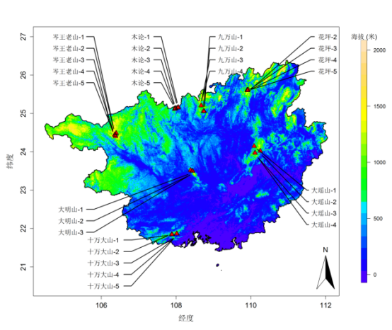 岑王老山保护区内设置5个1ha样地,海拔范围1365-1842 m,为南亚热带中山常绿阔叶混交林,位于百色田林县,经纬度24°21′45″~24°32′7″N,106°15′13″~106°27′26″E,年均降水量1666.2 mm,年均气温13.7℃。
