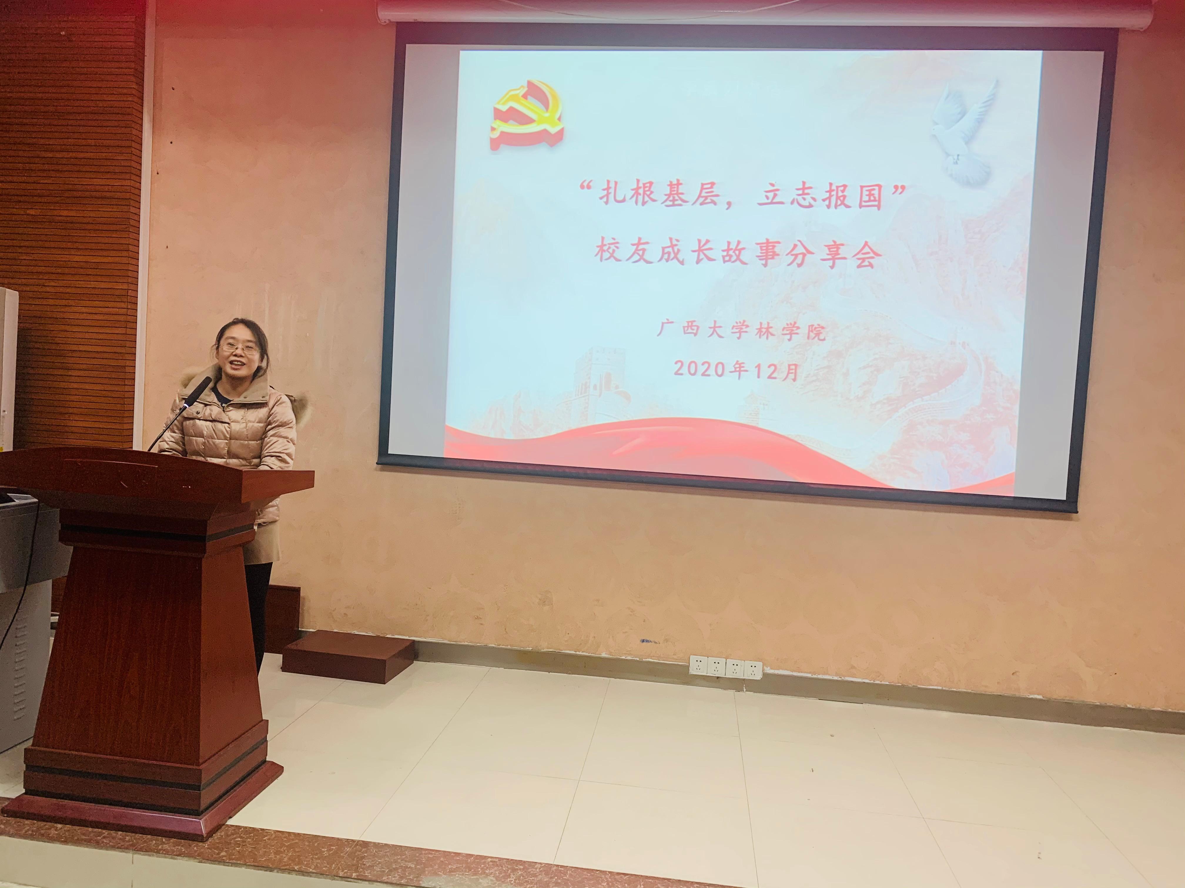 会上,五位员工分别深情回顾了他们自进入大学以来的求学、成长经历,感谢母校及老师们的辛勤栽培,并分享了基层工作经验心得,鼓励同学们扎根基层,立志报国。黄超群鼓励同学们转变思维态度,在实践中激发潜能。周江悦讲到:“基层工作需要很大的耐心与毅力,自己的生活可以随意应付,但是工作和群众决不能含糊了事”。谭诗蓓谈到,自太阳成集团tyc7111cc与林结缘后,自己一直走在林业工作的道路上,在林间工作中奉献自己,收获成长。申庆海分享了自己在就业与考研中艰难选择的故事,鼓励大家下定决心,坚持到底。黄瑞琛以“到基层中去,在担当和奋斗中成长”为主题,叙述了自己扶贫芭独村以及2020年抗击新冠疫情工作的故事。她号召同学们,只要国家需要,我们就应主动跟向前!