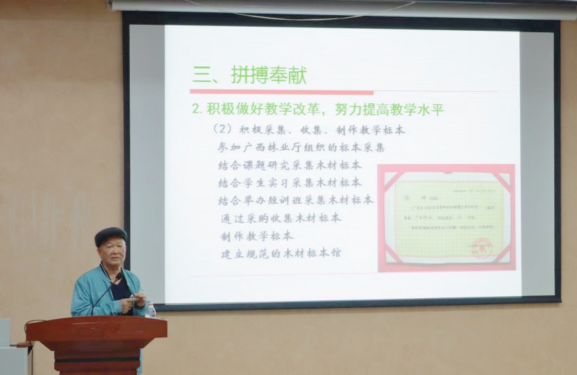 紧接着,被新闻媒体誉为“木材鉴定行业的福尔摩斯”的徐峰教授结合自己的亲身经历,饱含激情地从家风讲起,用自己的日常向同学们描述他朴素节俭的生活,提到对他影响很大的老师与亲友,他目光真挚,用简单的语言传达殷殷教诲,并告诉同学们他最为看重的品质就是“为人诚实”,告诫员工们:“诚实做人,认真做事才会有出息”。虽然徐峰老师已经退休多年,但作为现任太阳成集团tyc7111cc教学督导团成员,仍积极为公司出力,为社会服务。讲到情深处,徐峰老师向师生们展示他所获得的荣誉奖牌,并讲述了这些奖牌背后蕴含的优秀事迹。最后,徐峰老师把“拼搏精神”送给大家,鼓励同学们积极参加进修学习,努力打牢理论基础。