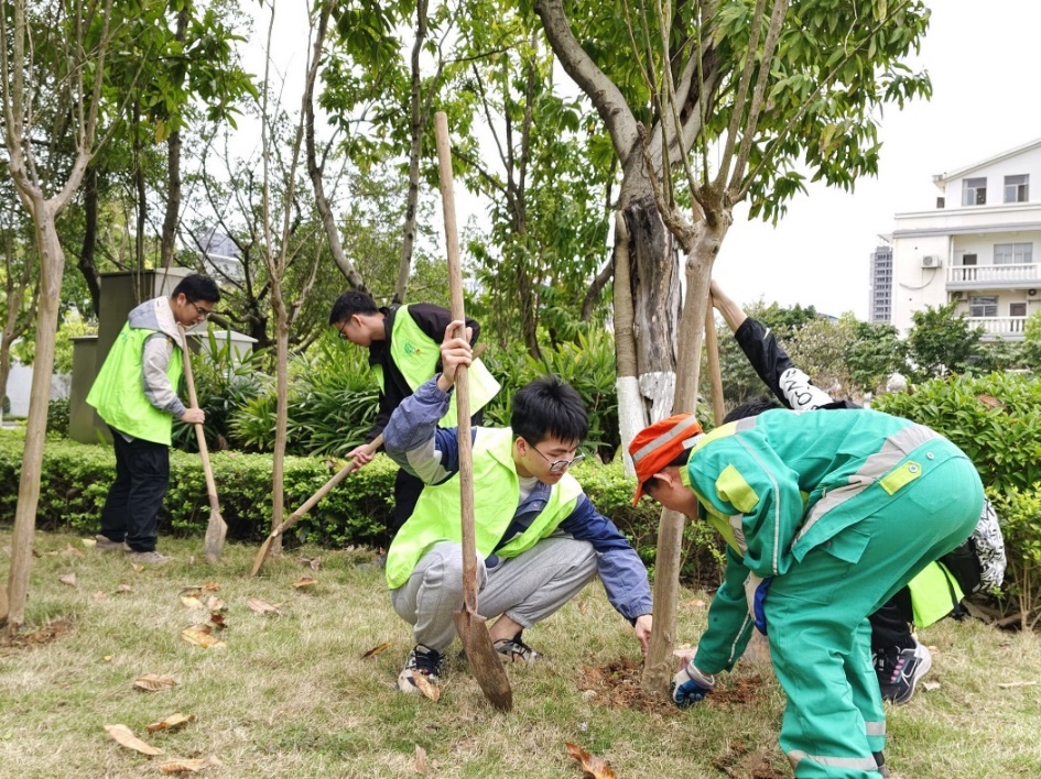 随后,党员们来到汇学堂西侧草地。在公司后勤基建处、博世科物业服务中心绿化技术人员的指导下,党员们纷纷扛起锄头,拿着铁铲,进行落叶清扫、杂草清除、松土施肥等工作。经过一个多小时的努力,整片绿地愈发整洁美观,为校园春色增添生机。