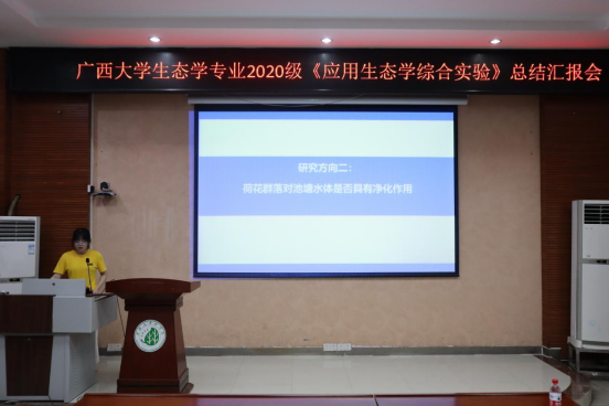 最后的课程结果汇报会上,课程6个小组分别以“植物群落结构和湖泊水质评价”、“南宁市那考河湿地公园生态系统净化功能相关研究”、“校园内统一立地条件下白花鬼针草与本地植物在土壤养分利用和化学计量的关系”、“荷花群落对池塘水体是否具有净化作用”、“探究碧云湖和月牙湖的植物配置差异对两湖湖水各水质指标的影响”、“城市不同湖泊单宁酸差异及溯源研究”、“人工湖水质对浮游植物的影响因素研究”为题,对课题实验研究的主要问题、对问题的假设、实验总体方案、实验结果与结论进行展示,介绍其研究成果。紧接着,老师们进行点评,在充分肯定同学们认真准备并努力呈现的同时,也指出了实验过程中由于缺乏经验或者准备不足的地方,并鼓励同学们思考改进、多加锻炼,继续成长,同时强调科学精神、发现错误与纠正错误的能力等培养是本实验课的重要教学目标,各组应秉持科学严谨的精神,认真检查实验操作、数据等是否正确可靠。最后提出同学们在本课程中培养自我思考能力、有所收获、有所进步的希冀。