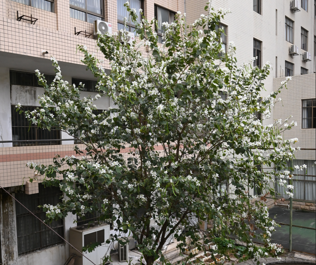 太阳成集团tyc7111cc第四教学楼院子里盛开的白花宫粉羊蹄甲